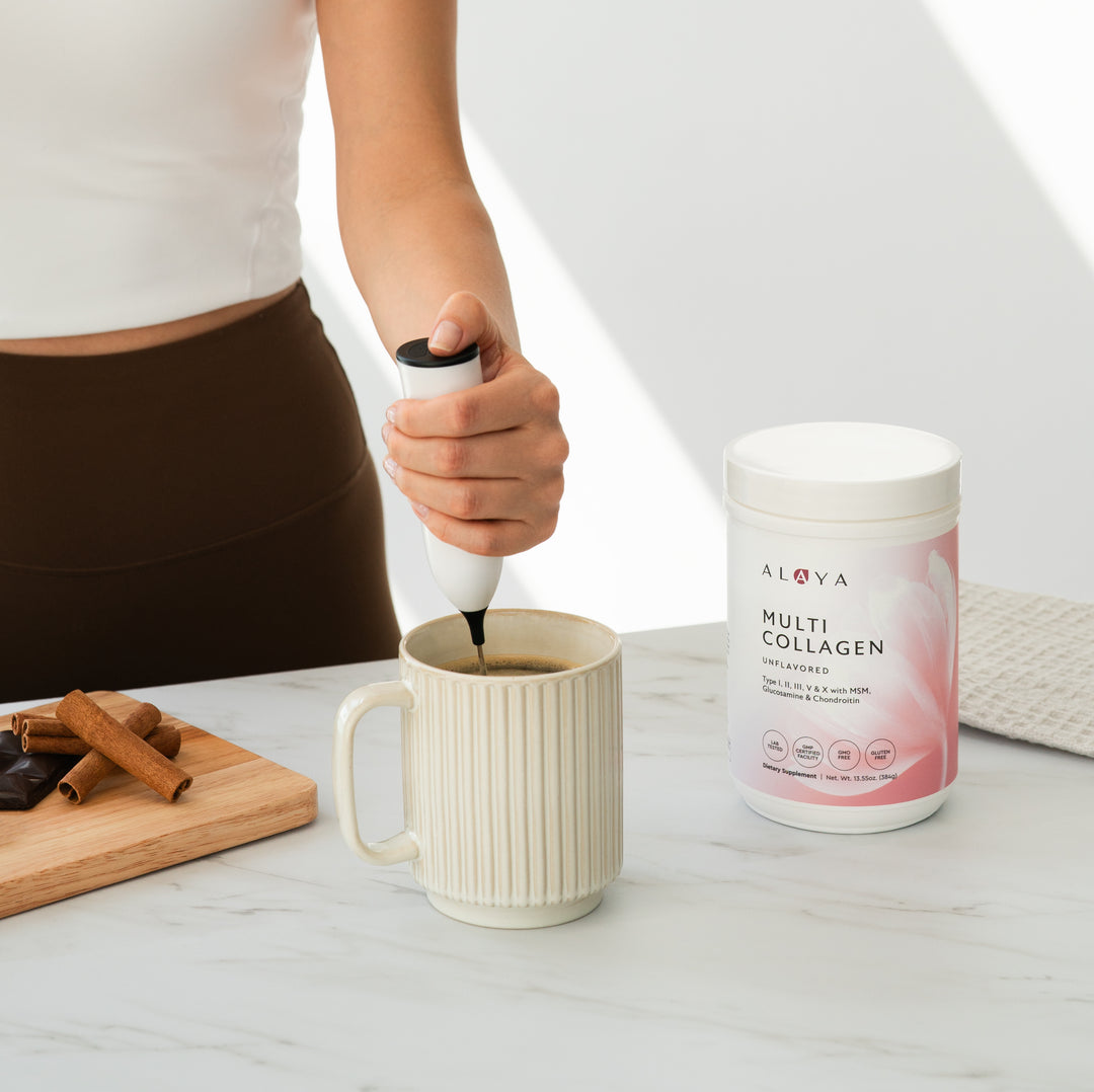 • Mix 1 scoop of Alaya Multi Collagen into 8–12 oz of your favorite drink (cold, warm, or hot).
